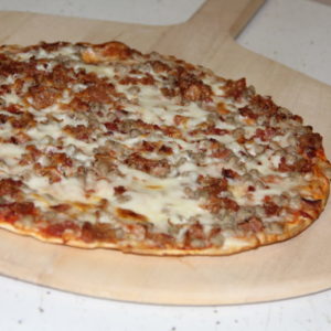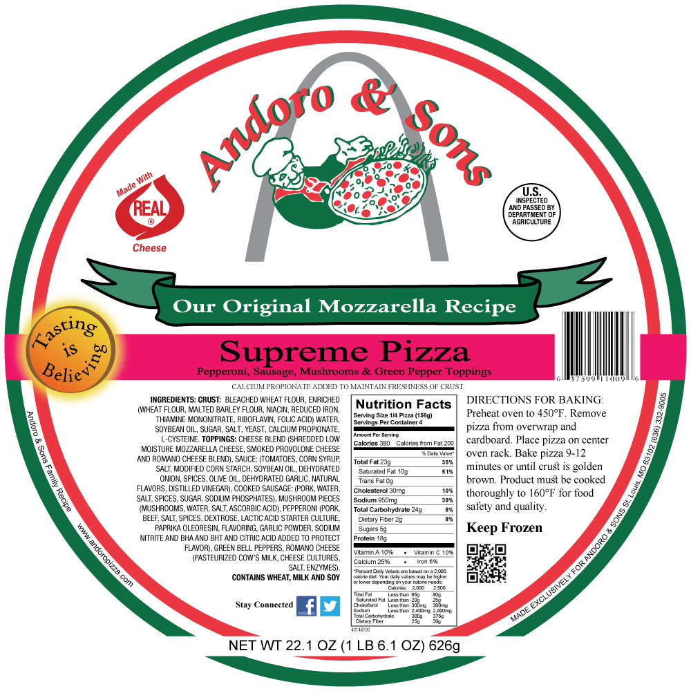 Andoro & Sons Pizza “Our Original Mozzarella” Pizza – a thin crust Supreme pizza with Our Original Mozzarella cheese blend. It comes topped with sausage, pepperoni, mushrooms and green peppers. It arrives frozen and fresh.